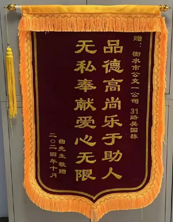 10月8日,一位市民帶著一面“品德高尚樂于助人 無私奉獻愛心無限”的錦旗來到衡水公交一分公司,對31路車長的暖心之舉表示感謝。