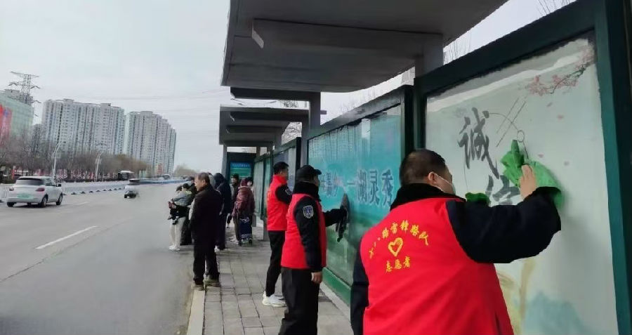 在公交候車站臺上,18路隊車長們車長們拿著抹布、鏟子、水盆等工具,擦亮了公交站牌、公益展板,擦洗了候車長凳、櫥窗,鏟除了小廣告等。為乘客提供了一個干凈、整潔、文明有序的乘車環境。