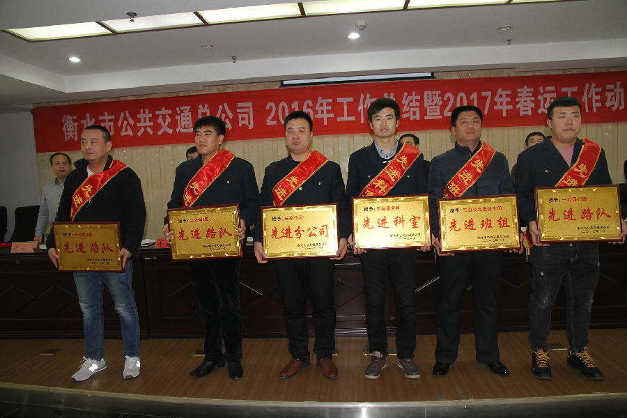會上,首先由李海江副總經(jīng)理宣讀《衡水市公共交通總公司關于表彰2016年度先進科室和先進個人的決定》。與會領導為先進科室和先進個人代表進行了頒獎。三分公司經(jīng)理孫福民同志、信息調(diào)度指揮中心主任楊紅霞同志作為先進代表分別做了表態(tài)發(fā)言。其次,王東伍副總經(jīng)理宣讀了《衡水市公共交通總公司2017年春運期間安全生產(chǎn)實施方案》。