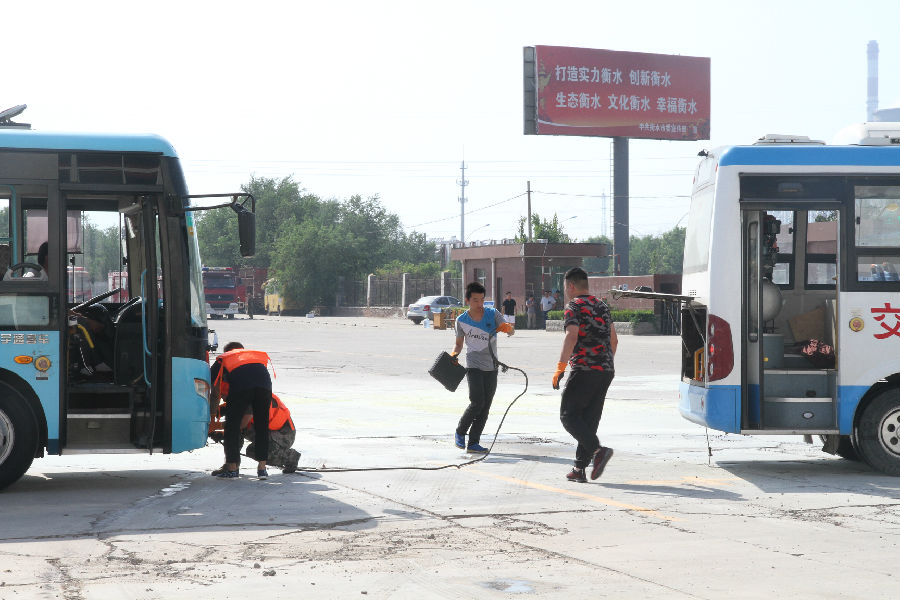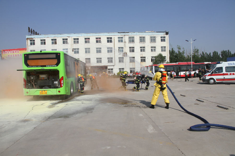 5月27日在一分公司停車場內(nèi),總公司舉行了“衡水市公共交通總公司2017年度安全生產(chǎn)綜合應(yīng)急實(shí)戰(zhàn)演練”活動(dòng)。演習(xí)由副總經(jīng)理王東伍同志主持,出席此次活動(dòng)的主要領(lǐng)導(dǎo)還有:市公安局經(jīng)保支隊(duì)支隊(duì)長張俊峰同志、市公安局經(jīng)保支隊(duì)副支隊(duì)長孟慶良同志、市消防支隊(duì)副參謀長梁勝同志。市消防支隊(duì)官兵、市公安局特警、市四院120急救中心醫(yī)護(hù)人員、市公共交通總公司公交駕駛員等共計(jì)110余人參加了此次演練活動(dòng)。共動(dòng)用大型車輛11臺(tái),包括:大型公交車2輛、公交應(yīng)急救援車2輛、消防支隊(duì)大型消防車3輛、特警防爆警車3輛、120救護(hù)車1輛。