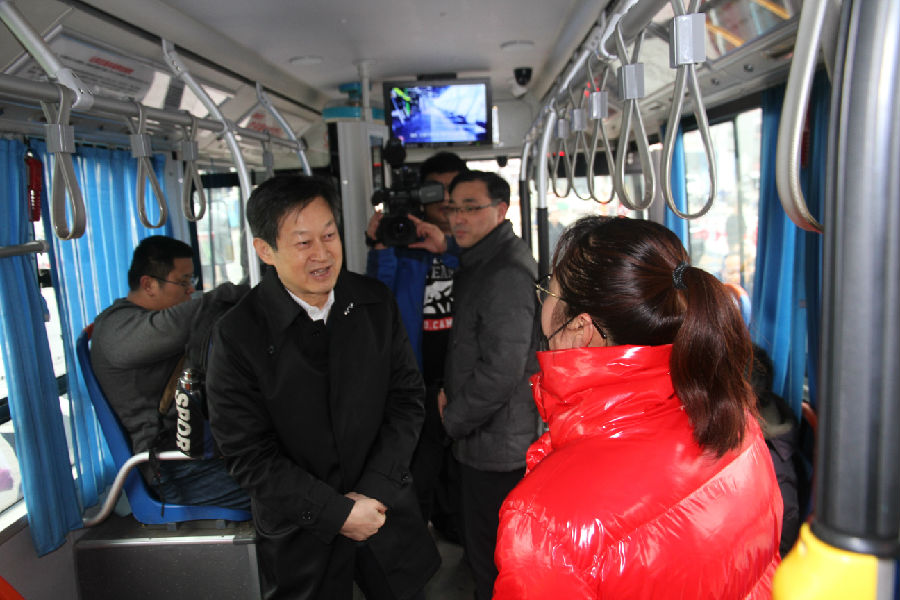 隨后,吳曉華饒有興致的登上2路新能源純電動公交車輛,親切詢問了駕駛員春運期間安全工作情況,并且熱情的同乘車乘客握手、聊天,詳細了解乘客有哪些需求以及對城市公交發展有哪些建議。