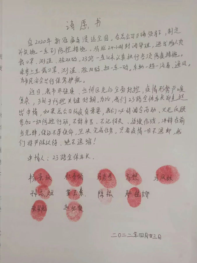近期,我市棗強縣與冀州區先后實施全域封控管理,疫情就在身邊,面對如此嚴峻形勢,衡水公交23路隊長楊景政立即萌生出“與疫情共進退,堅守抗疫一線,時刻聽從組織召喚”的想法。4月23日晚收車后他召開路隊會議,會議上他的想法得到了路隊全體車長紛紛響應,于是一封按滿紅手印的聯名“請愿書”遞交到了衡水公交總公司。